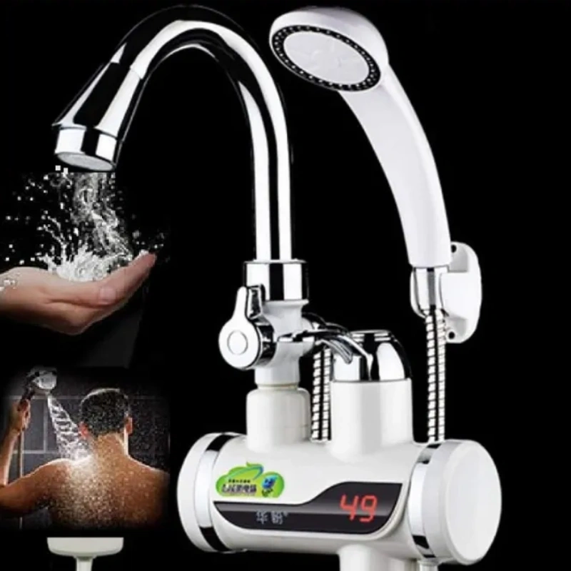 ইলেকট্রিক ইনস্ট্যান্ট ওয়াটার হিটার ট্যাপ সাথে হ্যান্ড শাওয়ার – আপনাকে মাত্র ৫ সেকেন্ডে গরম পানি সরবরাহ করে। এটি ৩০০০ ওয়াট ক্ষমতা সম্পন্ন, যা দ্রুত গরম পানি উৎপন্ন করে। শক্তিশালী এবং দীর্ঘস্থায়ী ABS ইঞ্জিনিয়ারিং প্লাস্টিক দ্বারা তৈরি, যা খাবার গ্রেড স্টেইনলেস স্টিলের সাথে যুক্ত। এলসিডি তাপমাত্রা ডিসপ্লে এবং ওভারহিট প্রোটেকশন এর মতো উন্নত ফিচার রয়েছে।